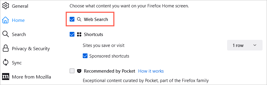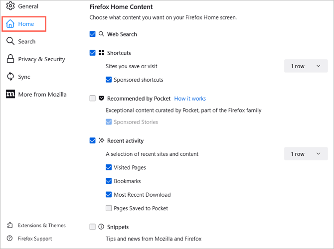 Gå tilbage til for at ændre denne sideApplikationsmenu>Indstillingerog plukHjemtil venstre. Brug derefter tilpasningsmulighederne iFirefox hjemmeindholdafsnit.