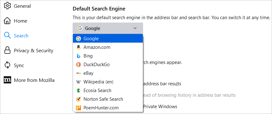 Du kan også vælge standardsøgemaskinen for denne boks og Firefox's søgelinje. Vælg til venstreSøge. Brug derefter drop-down boksen nedenforStandard søgemaskineat træffe dit valg.