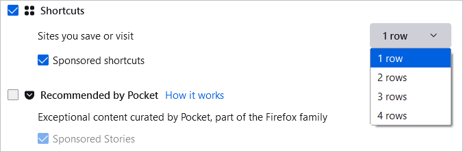 For at se websteder, du gemmer, skal du markere afkrydsningsfeltet forGenveje. Brug derefter rullemenuen til højre til at vælge antallet af rækker, du vil se. Du kan eventuelt markere muligheden for at seSponsorerede genveje.