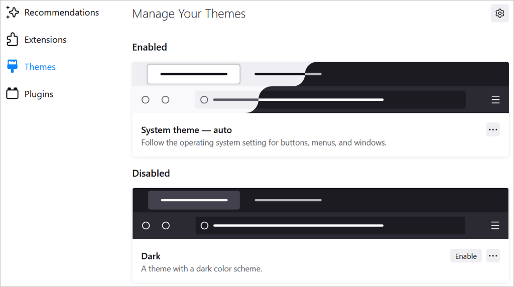 Du vil derefter se sektionen Administrer dine temaer i browserens indstillinger. Temaer, du installerer, vises øverst i enten sektionen Aktiveret eller Deaktiveret. Dette lader dig installere flere temaer og blot vælgeAktiverfor den du ønsker på det tidspunkt.