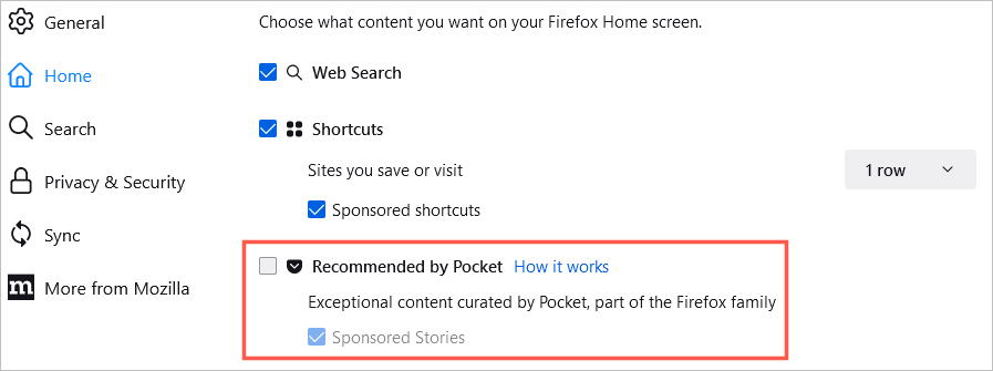 For at se anbefalede artikler fra Pocket skal du markere det næste felt. Eventuelt kan du vælgeSponsorerede historierogså.