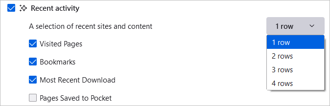 Markér afkrydsningsfeltet for hurtigt at få adgang til websteder, du lige har besøgtSeneste aktivitet. Brug derefter rullemenuen til højre for at vælge det antal rækker, du vil se. Du kan tilpasse den seneste aktivitet ved at bruge disse afkrydsningsfelter for besøgte sider, bogmærker og de andre muligheder.