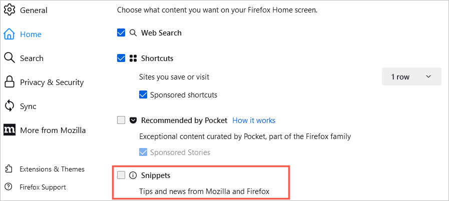 Endelig kan du vælge at se tips og nyheder fra både Mozilla og Firefox på din startside. Sæt kryds i boksen forUddragfor at vise disse elementer.