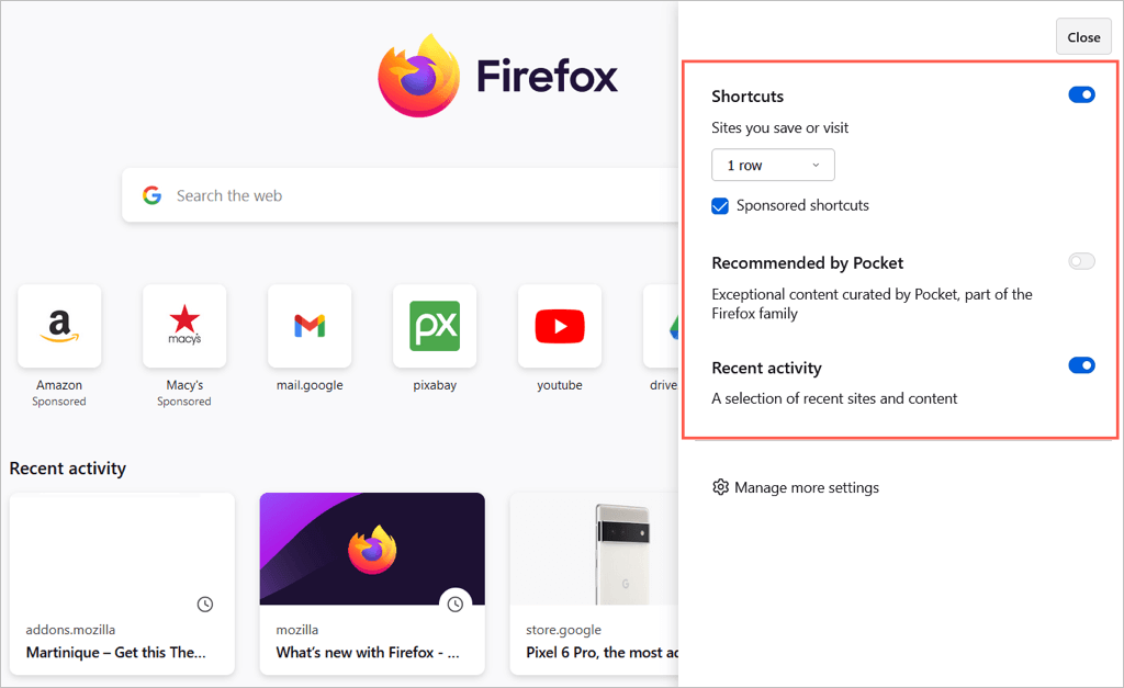 Brug derefter skifterne til at aktivere eller deaktivere Genveje, Anbefalet af Pocket og Seneste aktivitet.