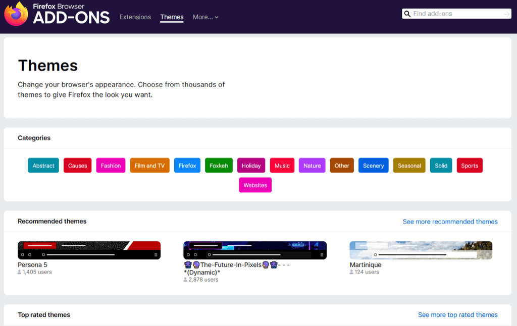 Vælg for at gennemse temaerFind flere temaernederst på siden. Du vil derefter se kategorier, anbefalinger, trending og topbedømte temaer i Firefox Add-Ons-butikken. Vælg en kategori eller vælgSe merelink til højre for et afsnit for at se samlingen.