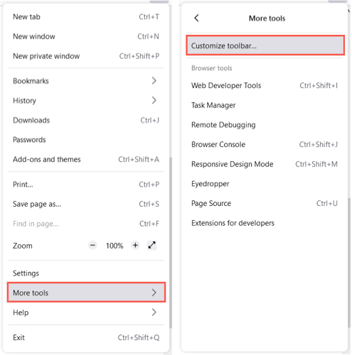 ÅbnApplikationsmenumed de tre streger øverst til højre. VælgeFlere værktøjerog plukTilpas værktøjslinje.