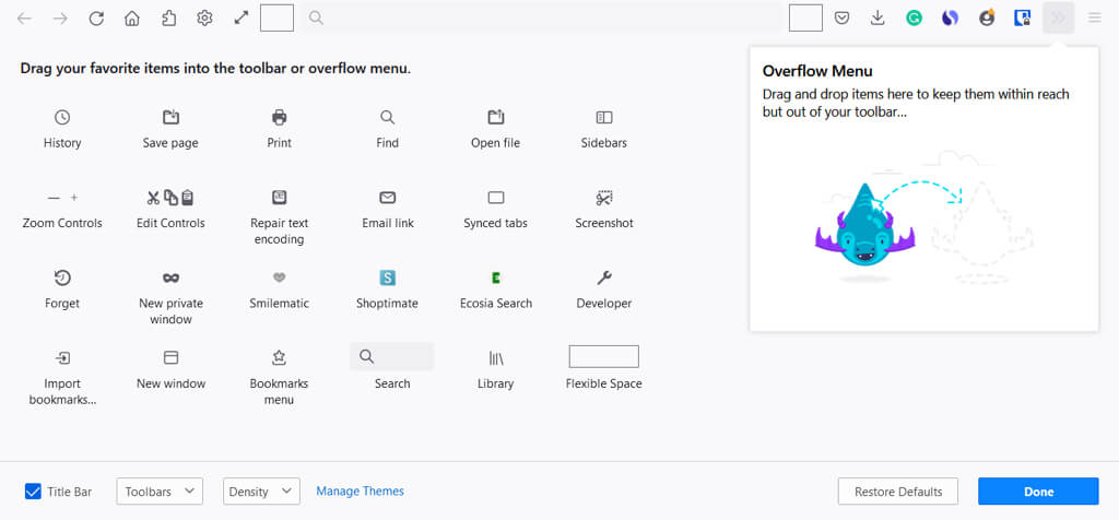 Du kan også tilføje elementer til overløbsmenuen. Dette holder dem praktiske, men ikke i hovedværktøjslinjen. Træk et element tilOverløbsmenuvindue.