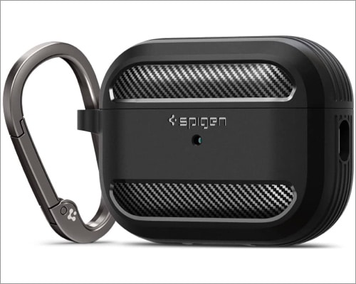 Jeg kunne godt lide dens ekstra soft-touch belægning, der giver en overlegen håndfølelse. Det todelte design er nemt at åbne og forhindrer interferens med hængslet på AirPods Pro. Desuden er coveret kompakt og kompatibelt med glat trådløs opladning. Du kan også bruge den indbyggede karabinhage som et fastgørelsespunkt til din taske, mens du rejser.