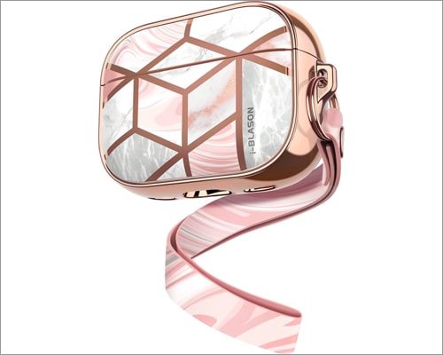 Hvis du vil have et attraktivt, stilfuldt etui til din AirPods Pro 2, så er i-Blason Cosmo etuiet et godt valg. Den er lavet af imiteret læder, der føles luksuriøst, og de stødabsorberende TPU-kofangere beskytter mod stød og pludselige fald. De teksturerede sidekanter sikrer også, at den ikke glider af din hånd.