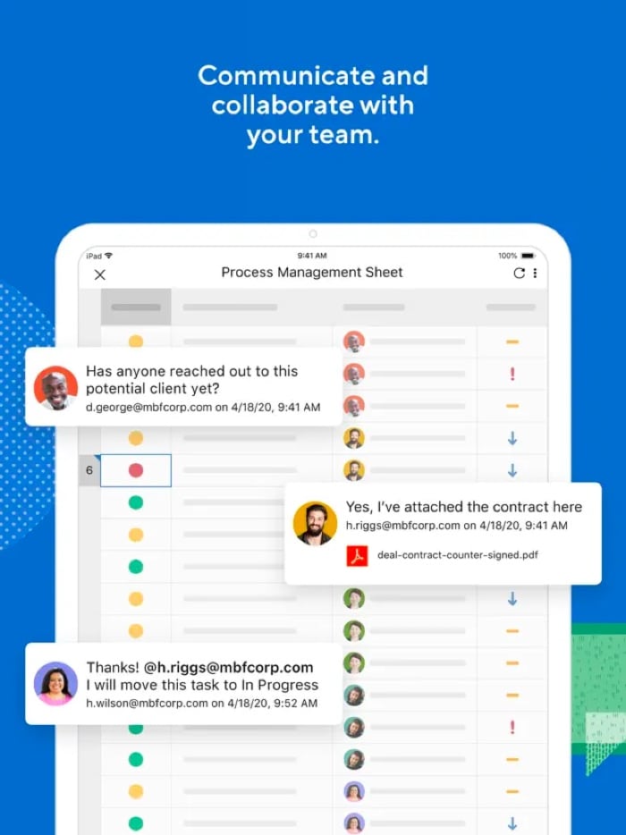Du kan øge produktiviteten ved at tilføje modtagere, forfaldsdatoer, følgere, tjeklister, forgængere og filer til dine opgaver. Desuden kan dit team samarbejde, redigere og kommentere på delte regneark. Det bedste er, at det sender automatiske anmodninger om opdateringer og godkendelser for at fremskynde arbejdet og spare tid.