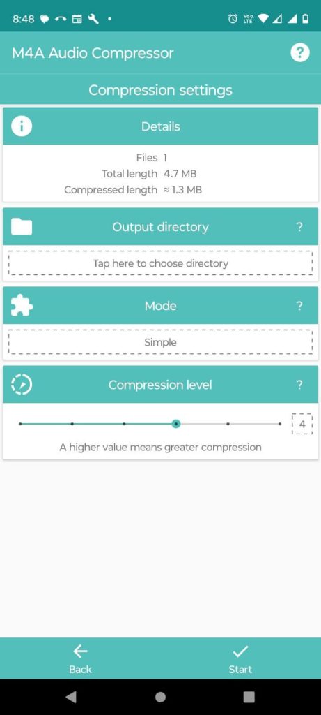Trin 5 –Når du har valgt parametrene, skal du trykke påStarte. Om få øjeblikke vil du være i stand til at reducere størrelsen af lydfiler på din Android-smartphone.