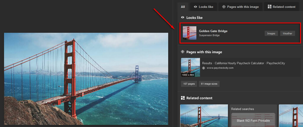 Hvis du ser et fascinerende billede online, eller du er lige foran vartegn, skal du bare søge på billedet med Bing. Du vil modtage resultater, der med stor sandsynlighed er det pågældende vartegn, sammen med links, der kan give dig lidt baggrund.