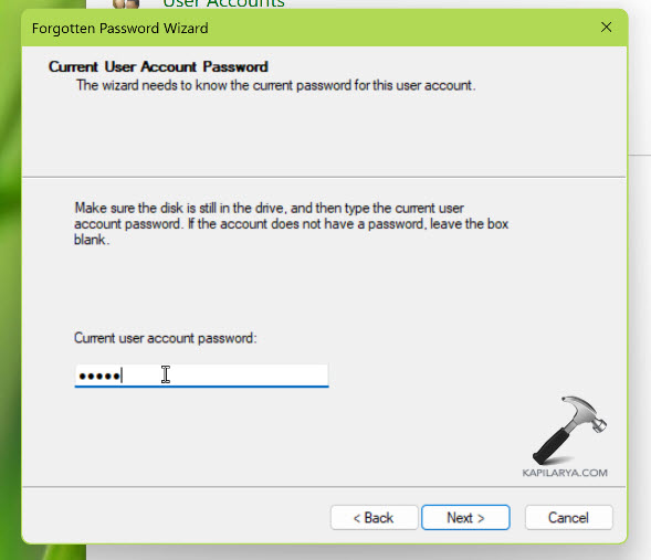 Du skal indtaste din nuværende kontoadgangskode for at oprette nulstillingsdisken. Klik på Næste.