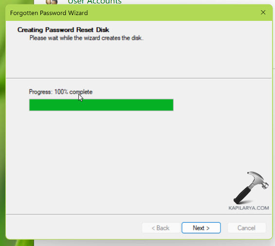 Guiden vil nu oprette disketten til nulstilling af adgangskode. Dette kan tage et øjeblik.