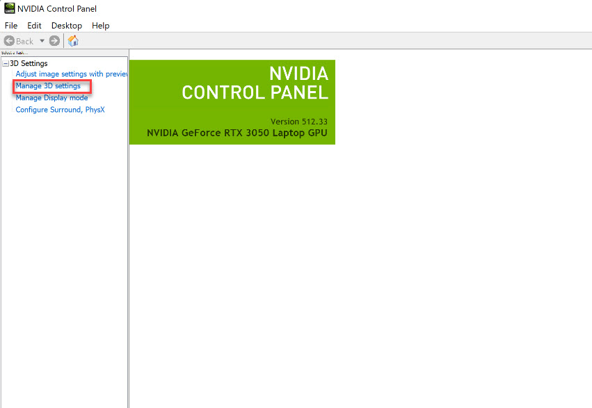 1. Åbn NVIDIA Kontrolpanel på din pc, og naviger tilAdministrer 3D-indstillinger.