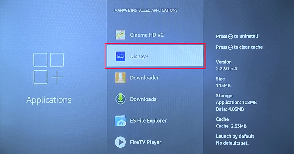 Gå tilIndstillinger>Ansøgninger>Administrer installerede applikationer>Disney+og vælgAfinstaller.