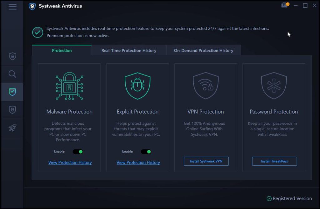 Systweak Antivirus er en sådan kraftfuld antivirus, der virker i realtid. Det identificerer forskellige typer malware og fjerner dem fra din pc. Udover malwarebeskyttelse giver denne fantastiske antivirus også beskyttelse mod udnyttelse og firewall. Med hensyn til ondsindede websteder tilbyder Systweak Antivirus en webbeskyttelsesfunktion, der forhindrer brugere i at besøge ondsindede websteder og phishing-websteder.