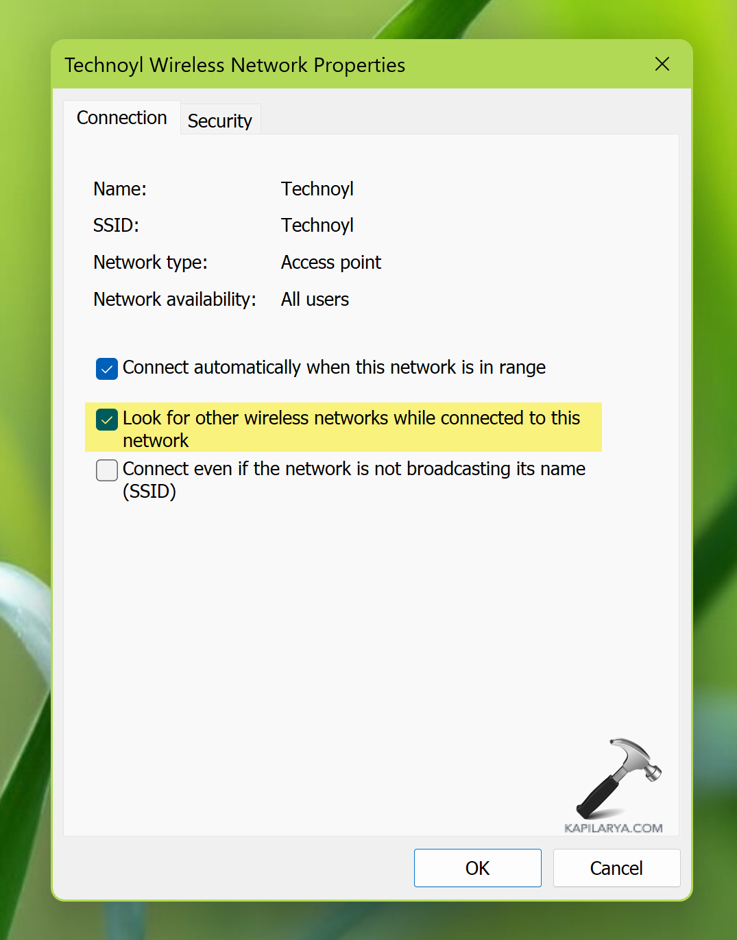 5. Marker Søg efter andre trådløse netværk på netværksegenskabsarket, mens du er tilsluttet dette netværk. Klik på Anvend, OK.
