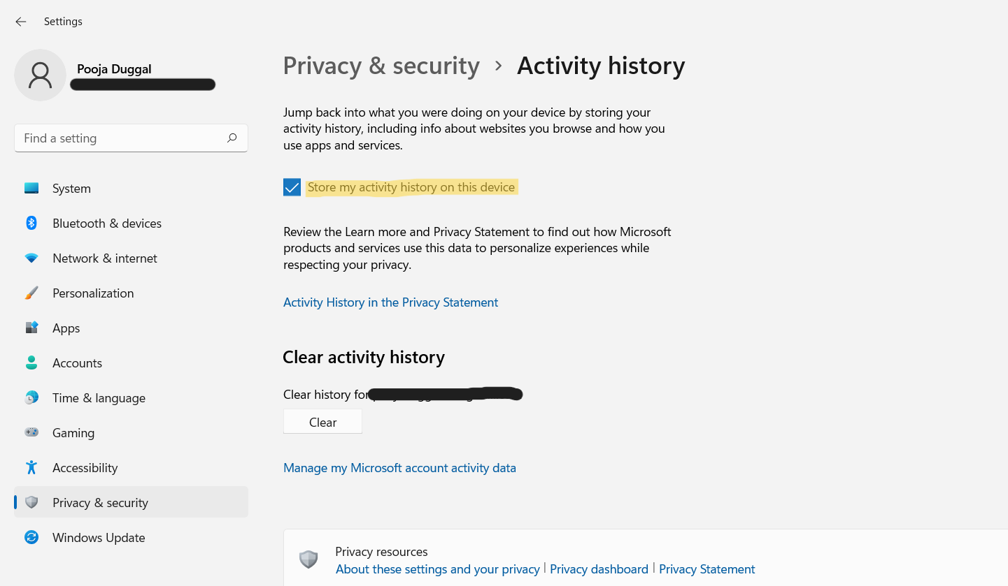 Aktiver eller deaktiver aktivitetshistorik i Windows 11