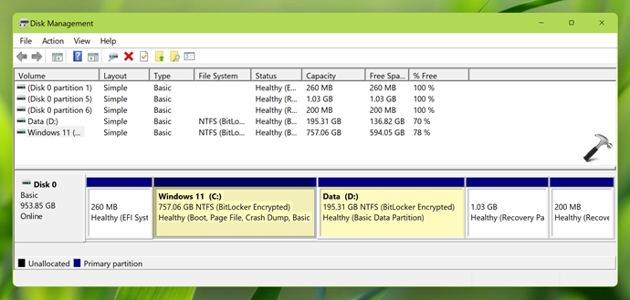 Når Device Encryption er aktiveret, kan du åbne Disk Management, og her vil du opdage, at dine enhedsdrev nu er BitLocker-krypteret. Dette indikerer, at enhedskryptering nu er aktiveret på dit Windows 11 Home.