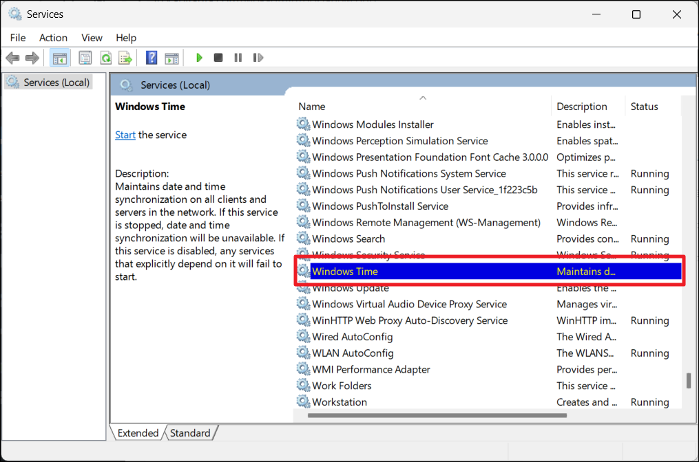 3. Find "Windows tid" tjeneste, højreklik på den og vælg "Egenskaber“.