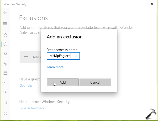 5.Skriv i Tilføj en ekskluderingMsMpEng.exeog klikTilføje.