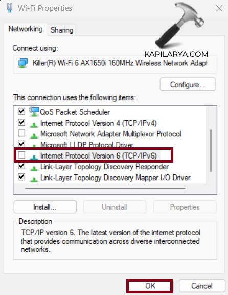 7. Fjern markeringen i "Internet Protocol Version 6 (TCP/IPv6)".