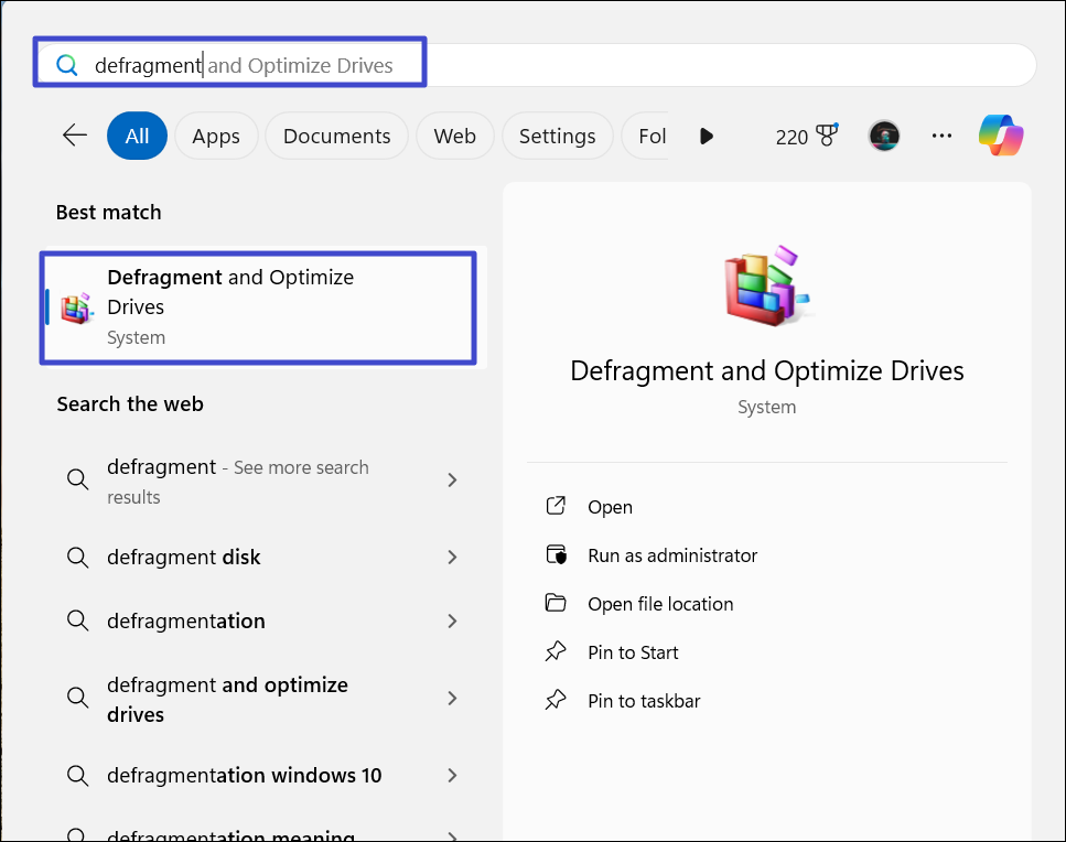 1. Klik på knappen Start, skriv "defragmentere" i søgefeltet, og vælg "Defragmenter og optimer drev” fra resultaterne.
