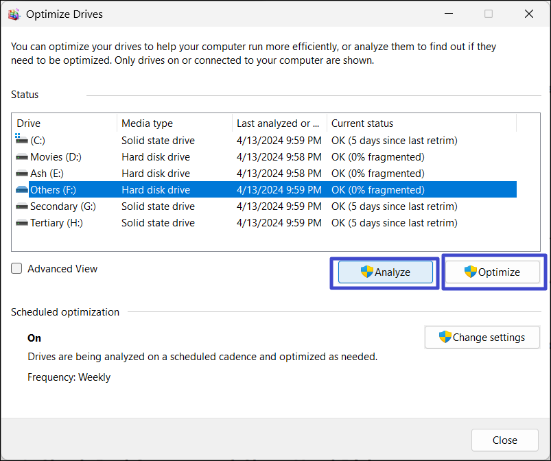 3. Først skal du klikke på "Analysere" for at analysere disken for fragmentering. Klik derefter på "Optimer” for at defragmentere drevet.