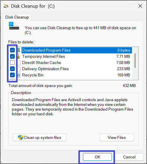 3. Vælg derefter de filer, du vil slette somMidlertidige internetfiler,Papirkurv,Midlertidige filer,osv., og klik på "OK“.