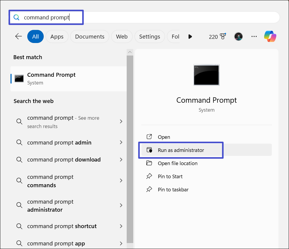 1. Skriv "Kommandoprompt"i Windows-søgningen og vælg "Kør som administrator“.