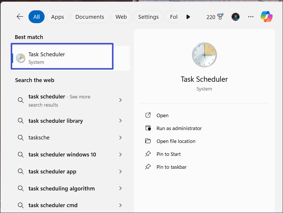 1. Tryk på Windows + S, skriv "Opgaveplanlægger", og vælg "Opgaveplanlægger" nytte.