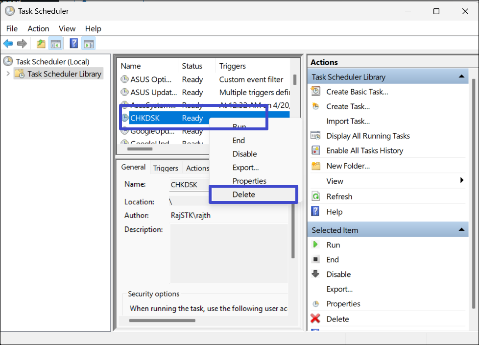 I nogle tilfælde, hvis CHKDSK er indstillet som en planlagt opgave, kan den sætte sig fast, når Windows starter. For at forhindre dette skal du fjerne CHDSK fra den planlagte opgaveliste.