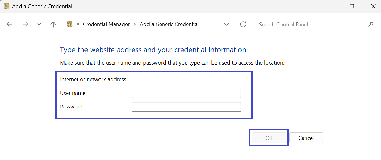 Fix 1: Indtast legitimationsoplysninger manuelt i Credential Manager