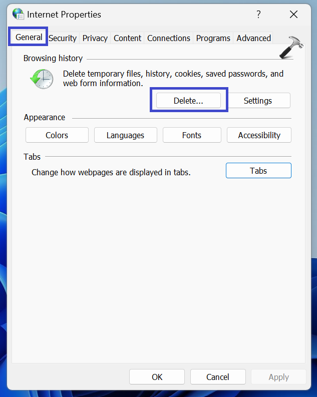4. Gå nu til "Generelunder fanenBrowserhistoriksektion, klik på "Slet...”-knappen.