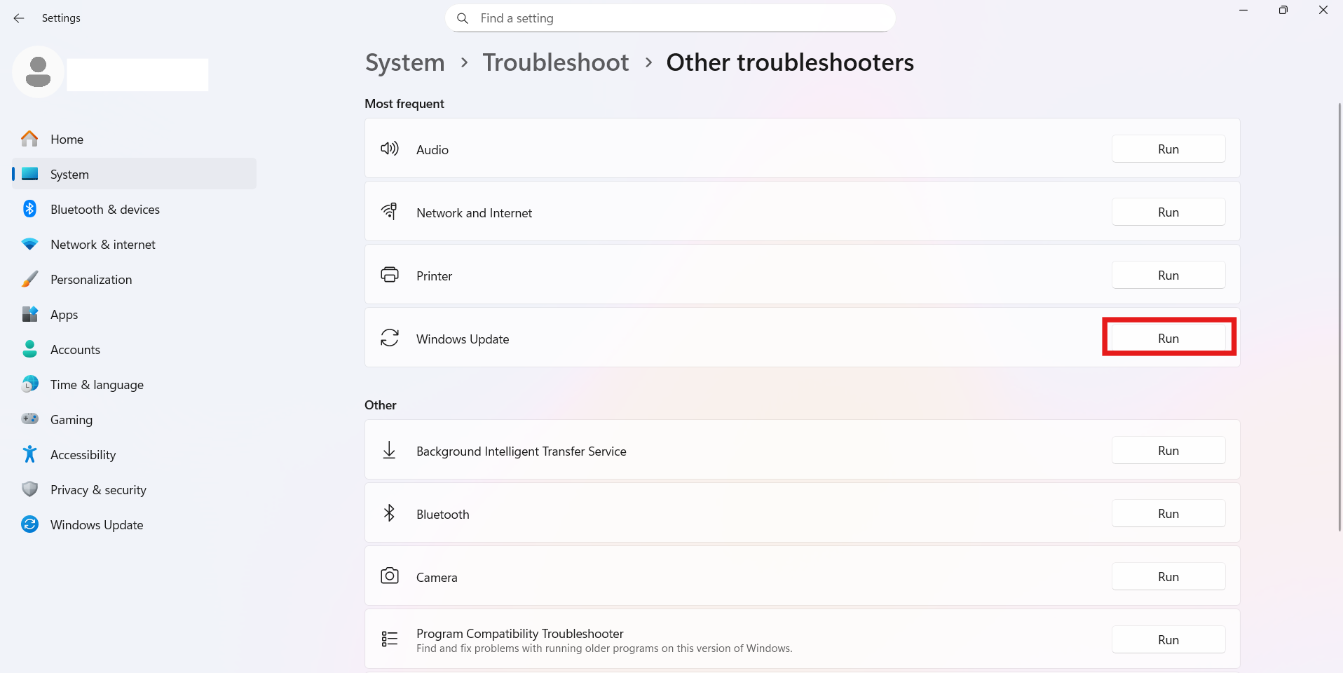 3. Find Windows Update, og klik på Kør.