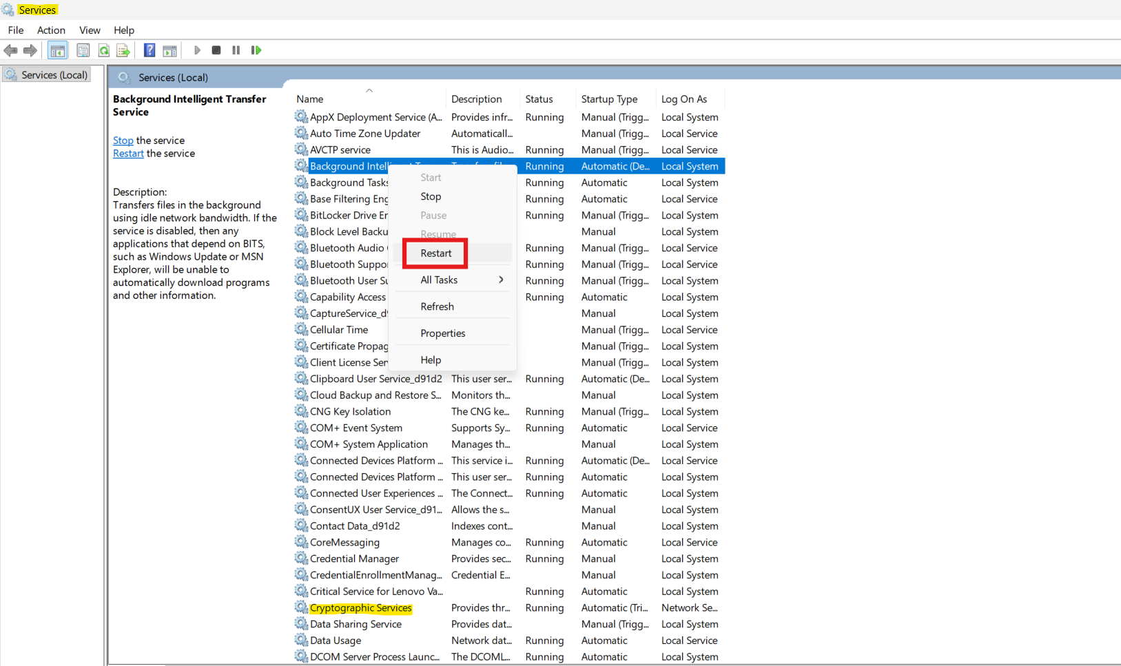 2. Find Windows Update, Background Intelligent Transfer Service (BITS) og Cryptographic Services.