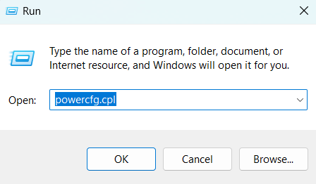 1. Åbn Kør-prompten ved at trykke på Windows + R-tasterne og skriv derefterpowercfg.cplog klik derefter på knappen OK.