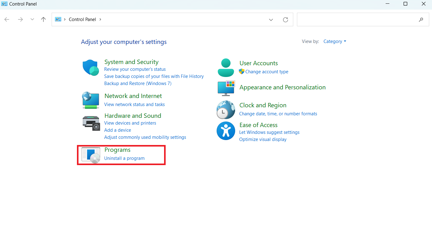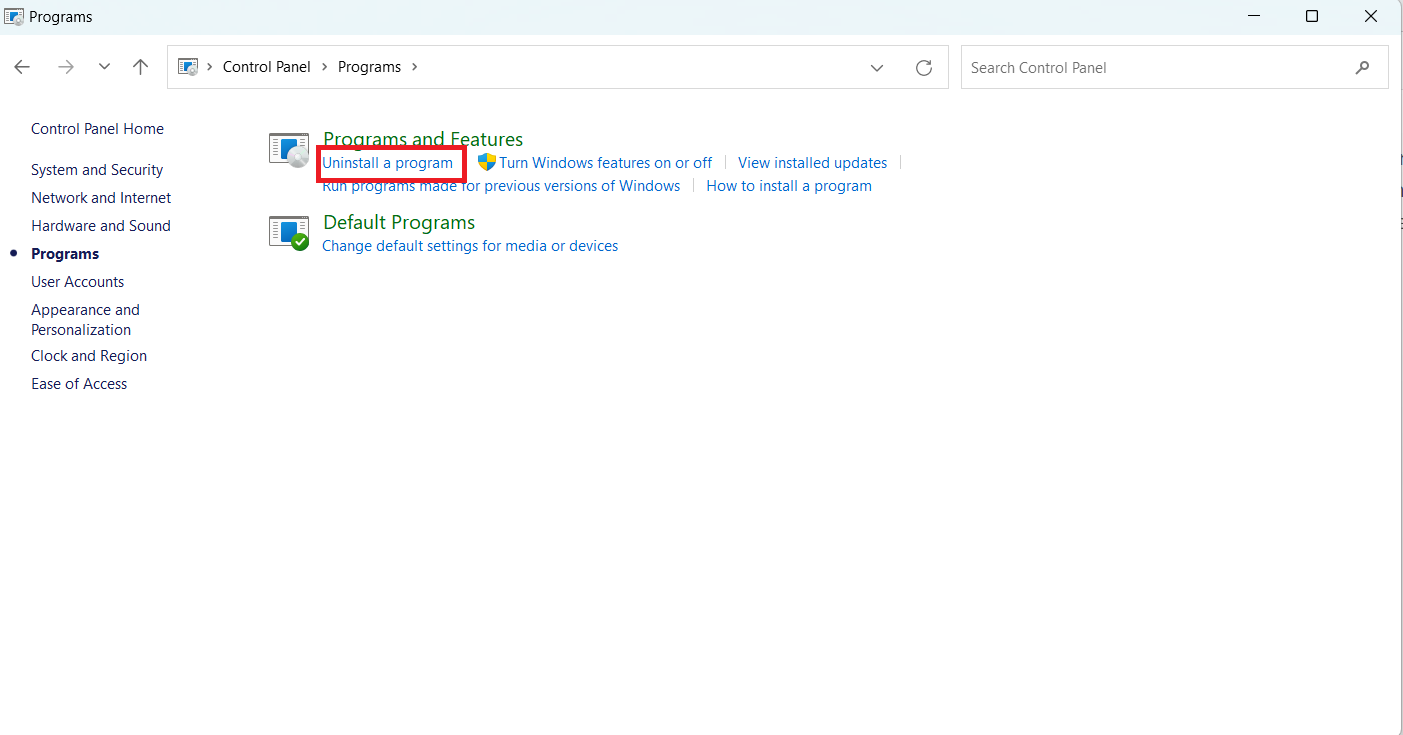 Klik derefter påAfinstaller et programiProgrammer og funktioner.