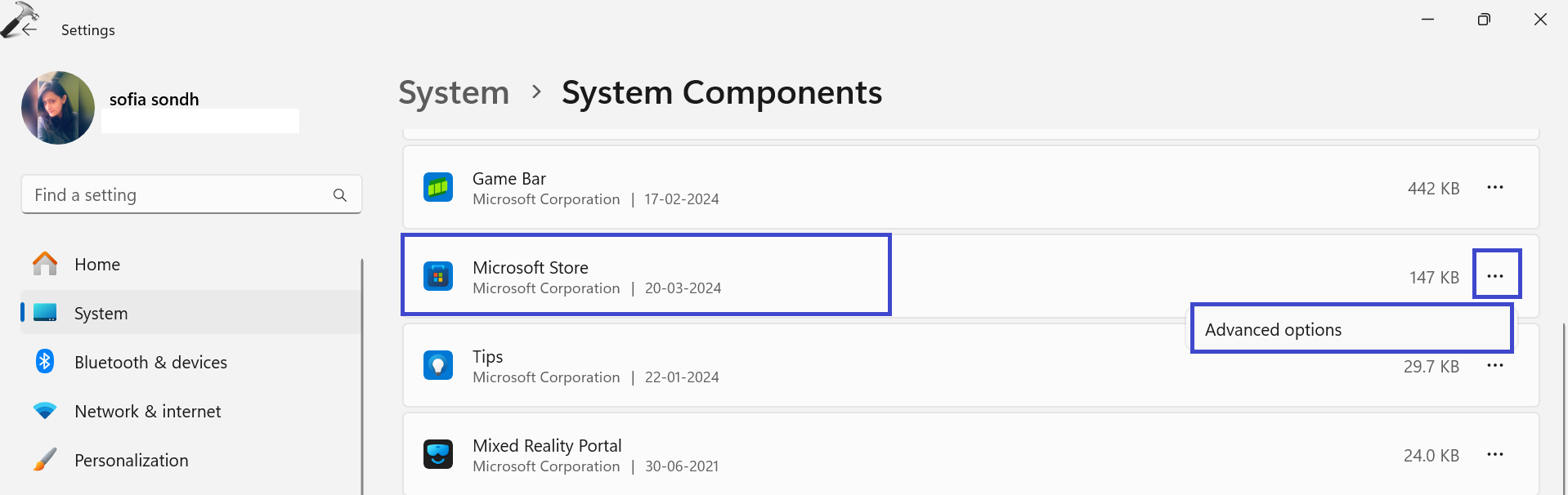 3. Klik på ellipsen (...) ud for "Microsoft Store" og vælg "Avanceret mulighed" mulighed.