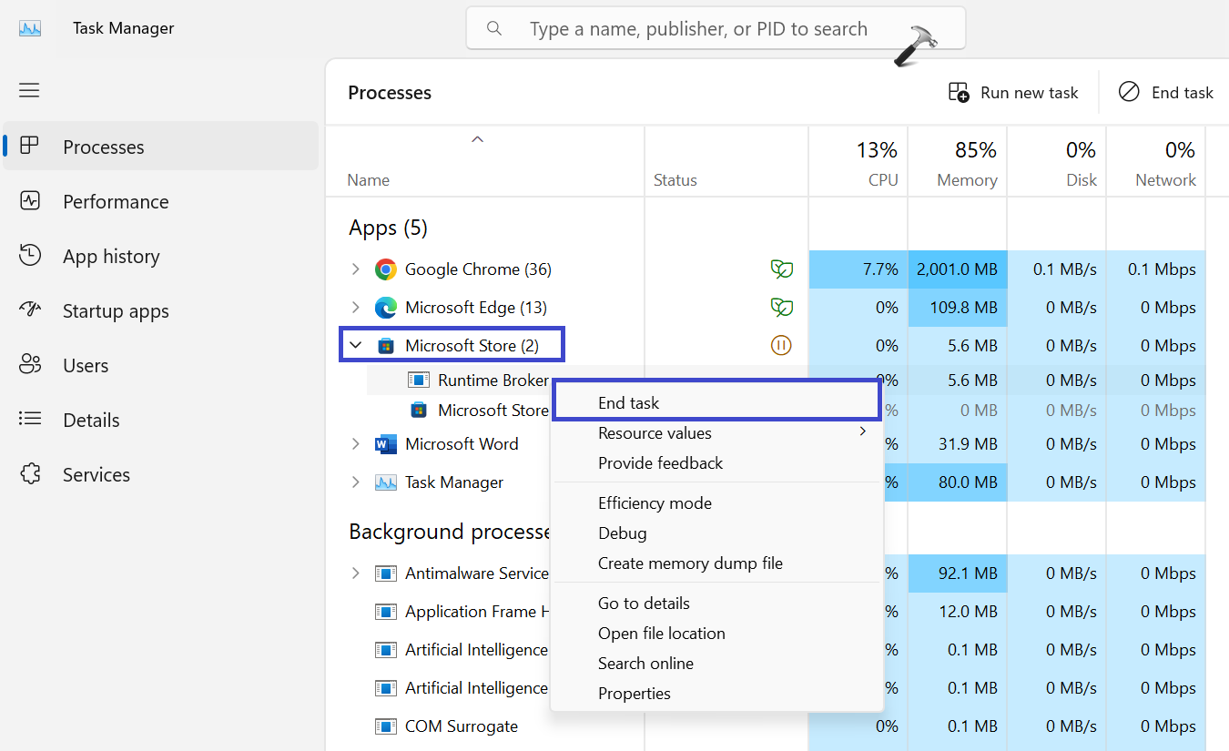 Identificer eventuelle processer relateret til Microsoft Store (f.eks. Microsoft.WindowsStore.exe). Klik på den og klik på "Afslut opgave“.