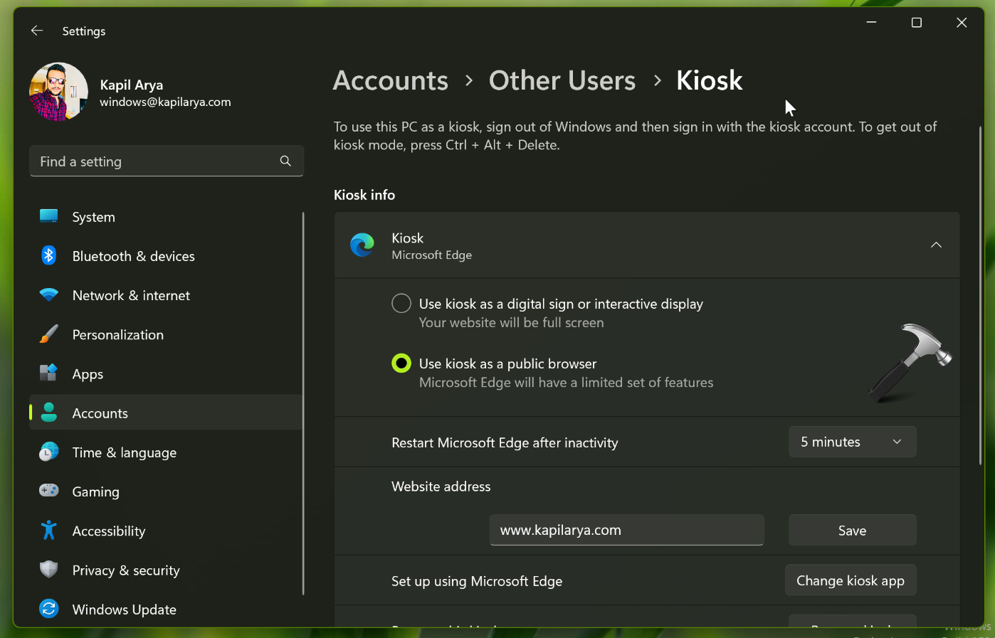 5. Genkonfigurer Kiosk-tilstand. Afslut kiosktilstand og genstart enheden. Fjern kioskens brugerprofil helt. Genkonfigurer kiosktilstand fra Indstillinger > Konti > Familie og andre brugere > Konfigurer en kiosk.