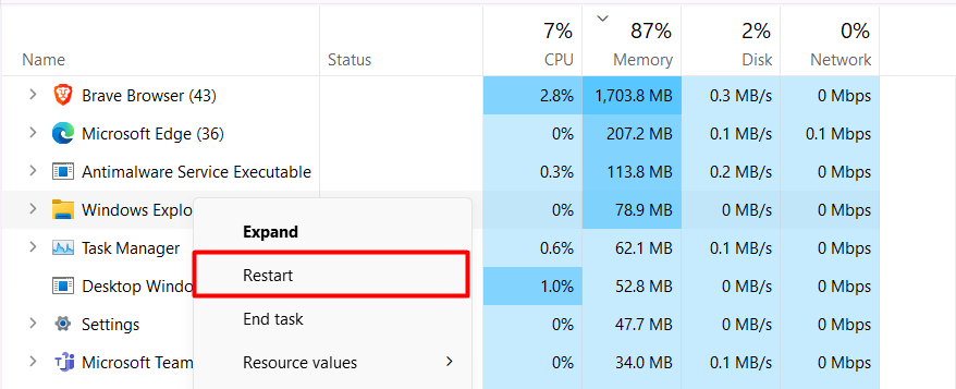 2. Højreklik på Windows Stifinder og tryk på "Genstart".