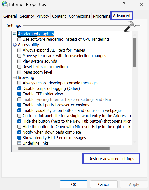 2. UnderFremskredenfanen, klik på "Nulstil avancerede indstillinger“.
