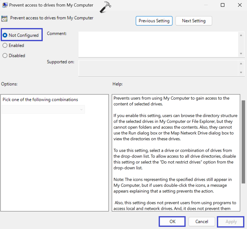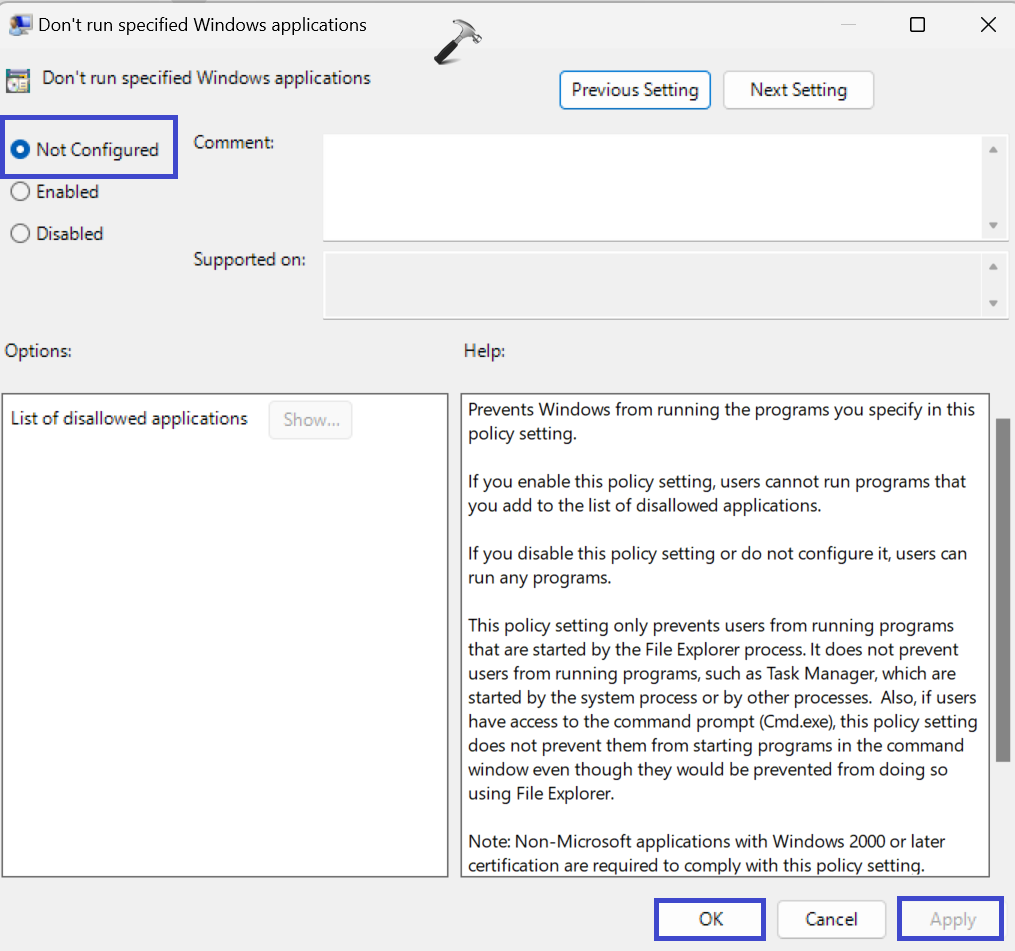 Vælg "Ikke konfigureret” og klik på OK efterfulgt af Anvend.