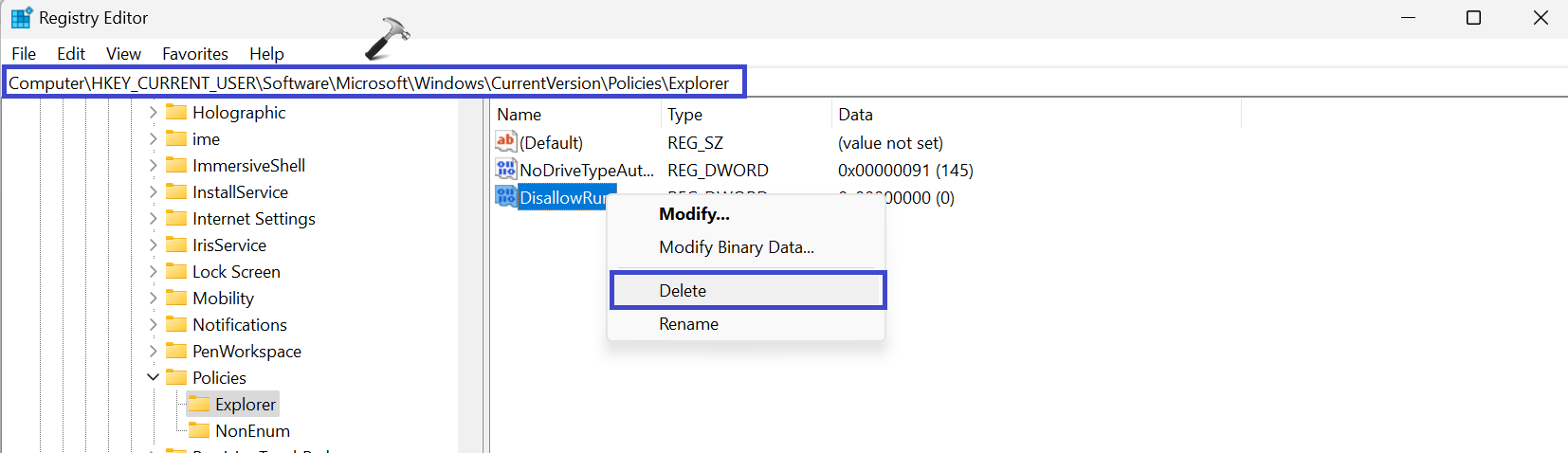HKEY_CURRENT_USER/Software/Microsoft/Windows/CurrentVersion/Policies/Explorer