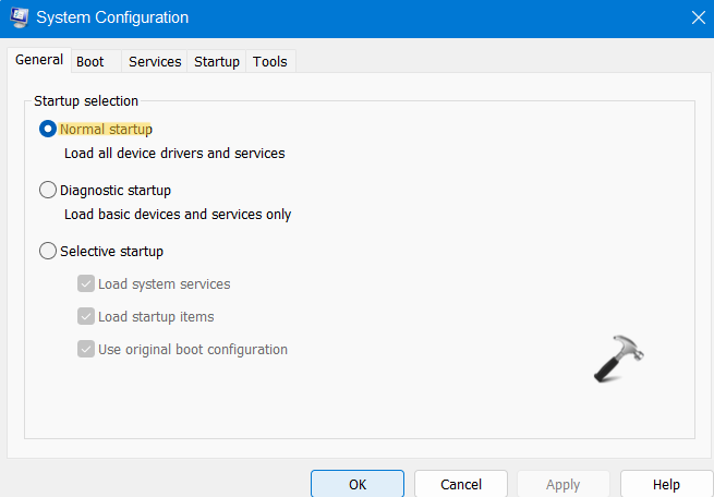 2.Gå tilGenerelfanen og vælgNormal opstartog trykOK.
