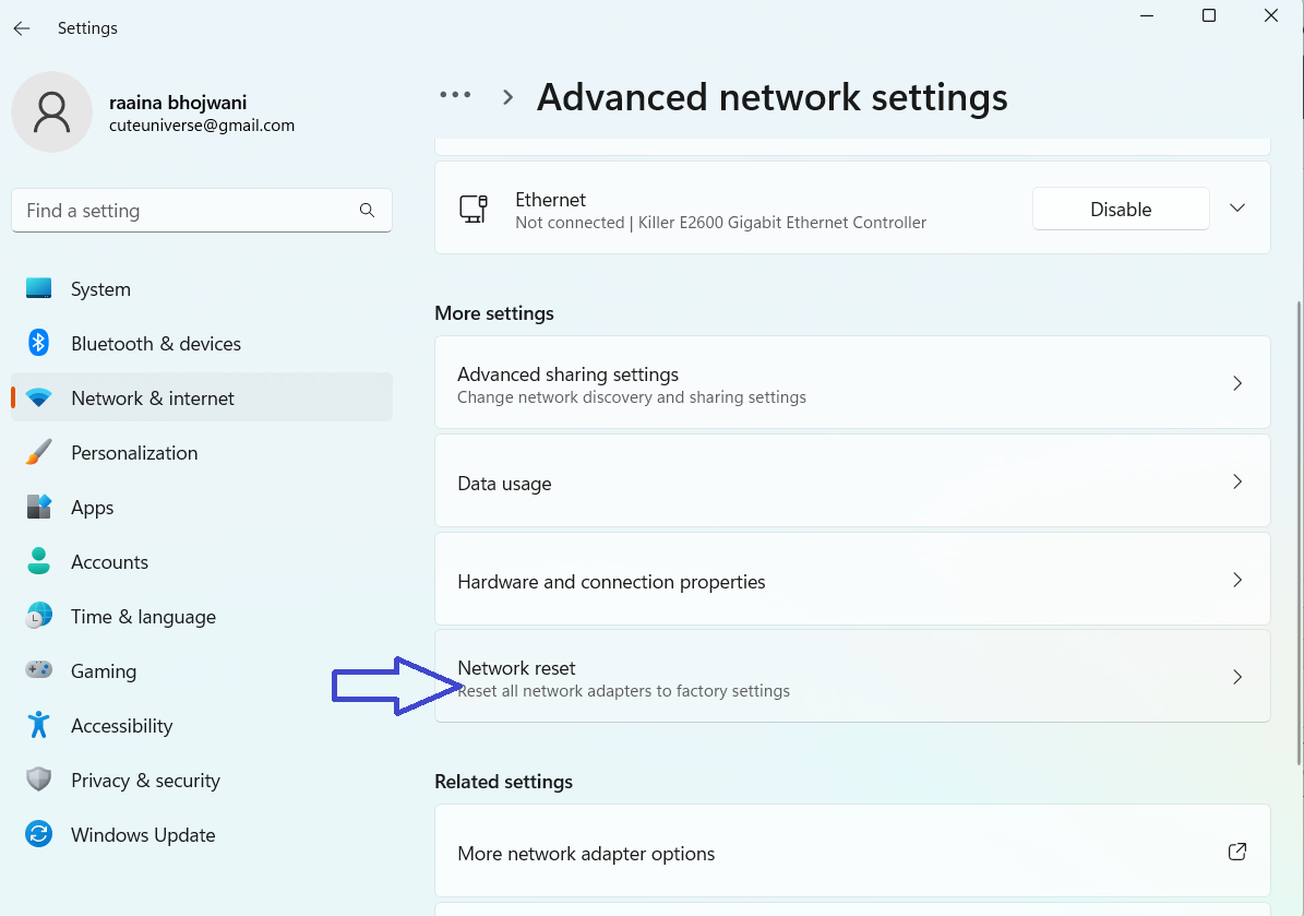 2. Klik på “Netværk og internet” > klik på “Avancerede netværksindstillinger”.