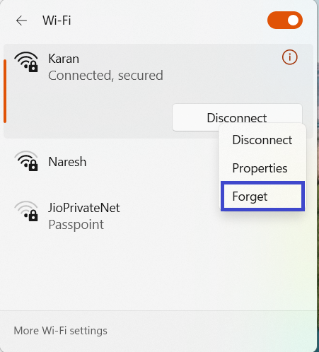 3. Højreklik på det WiFi-netværk, du normalt bruger. Vælg Glem.