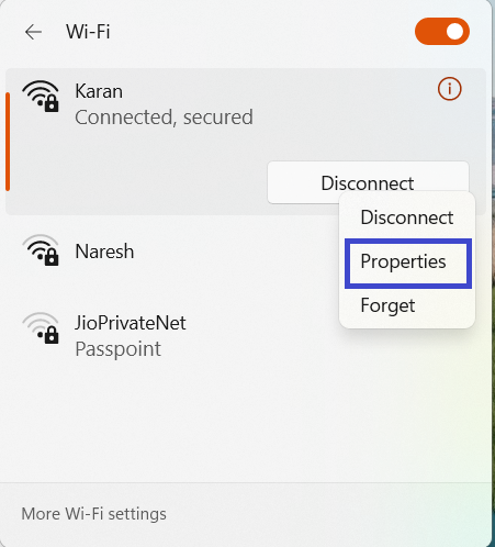 3. Højreklik på det WiFi-navn, der normalt er tilsluttet dit system, og vælg "Egenskaber".